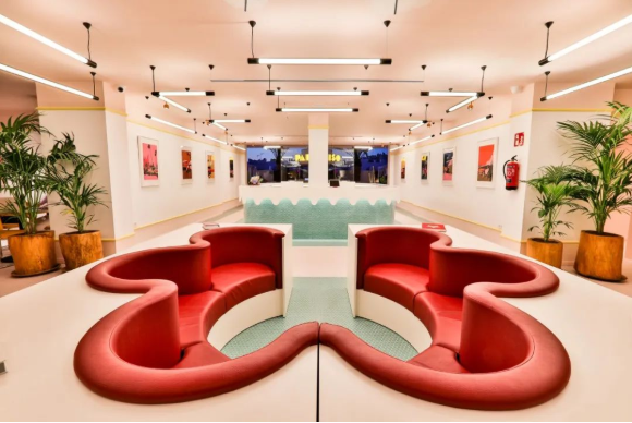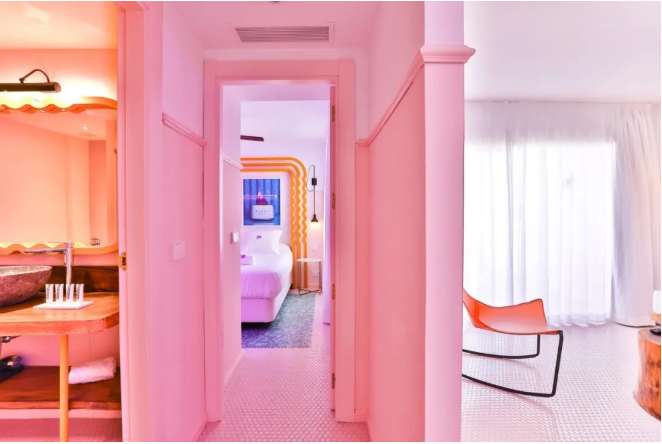 走進伊維薩天堂藝術酒店,瞬間就像掉入一個如夏日冰淇淋一般甜蜜繽紛的多彩世界:地面鋪設了粉紅色的馬賽克瓷磚,涂漆的墻壁和天花板,大廳中央巨型花型紅色沙發……無不帶來強烈的視覺沖擊感。